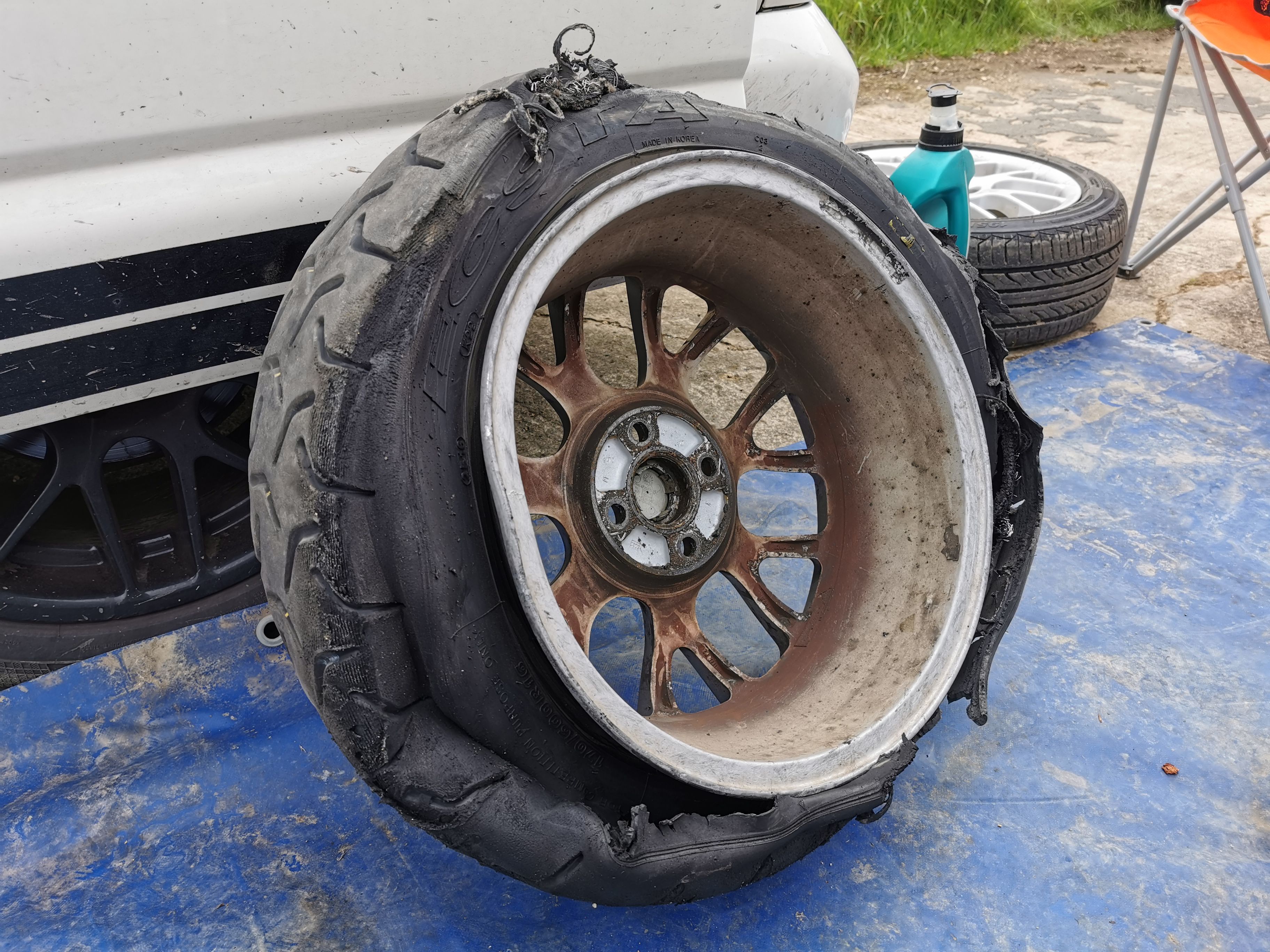 Stage three was fun for the first 2 miles. Unfortunately, the previous car had clipped the verge pulling a large rock onto the stage. As we came round the corner, I’d already hit the rock before I could adjust our road position. It was obvious that something was damaged but we continued on as the car still handled ok. At this point we had another five miles of the stage left, and as we continued the car was almost impossible to turn right. We reached the finish line, receiving a time that was better than a stage maximum. On returning to service, we discovered the tyre was shredded and the wheel was egg shaped. No real surprise as it was a huge rock and we were still pushing 100mph with a flat tyre.